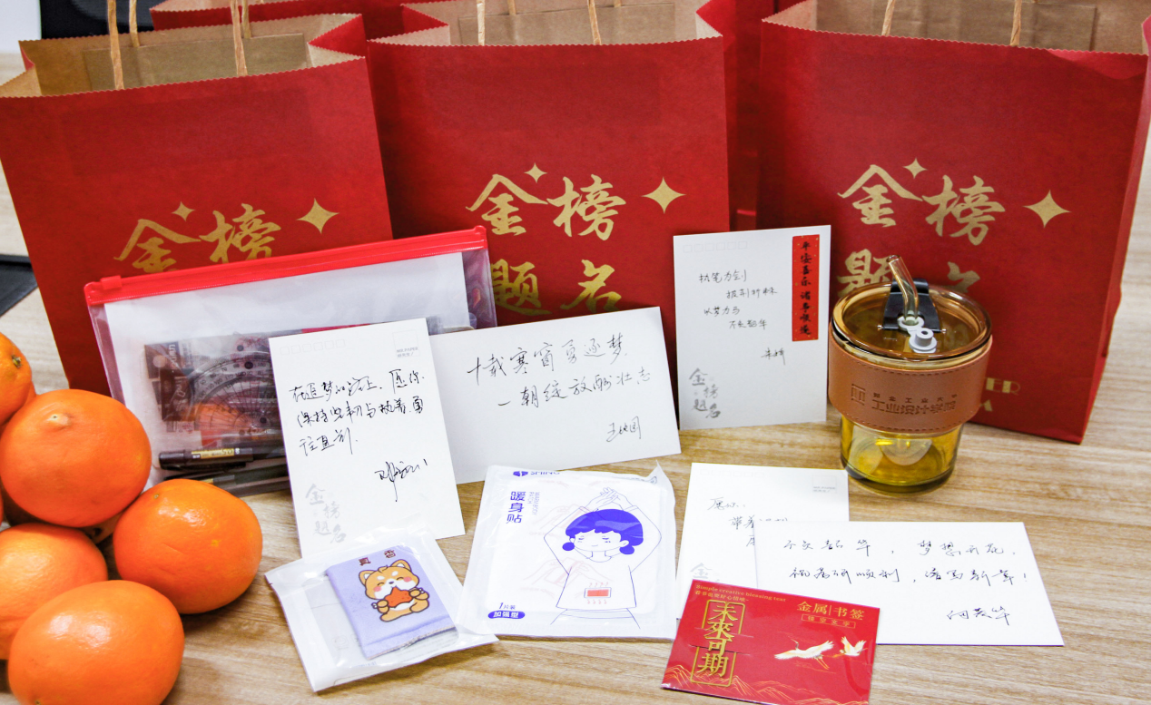 最后,龚发云和学院领导向考研学生赠送慰问礼包。鲜艳的礼包里有校院领导和老师们亲手题写的祝福贺卡、定制的精美水杯、考研笔袋套装、暖宝宝、金色书签、美味橙子等,寓意温“暖”傍身、“笔”下生花、“金”榜题名、“橙”功上岸,前程似锦。“礼轻情意重”,精美的慰问礼包不仅是一份物质的关怀,更是对同学们的一份美好祝愿和精神鼓励。