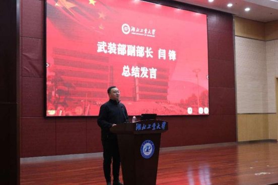 闫锋首先向我院颁发了征兵工作先进单位奖牌并作总结讲话。他的从国际国内形势、参军入伍的的重大政治意义、学校对参军入伍学生的关怀等方面进行了总结动员。他向同学们发出号召,希望更多的工设学子投身国防事业,增强军事报国情怀,为国家的发展与安全贡献自己的力量。