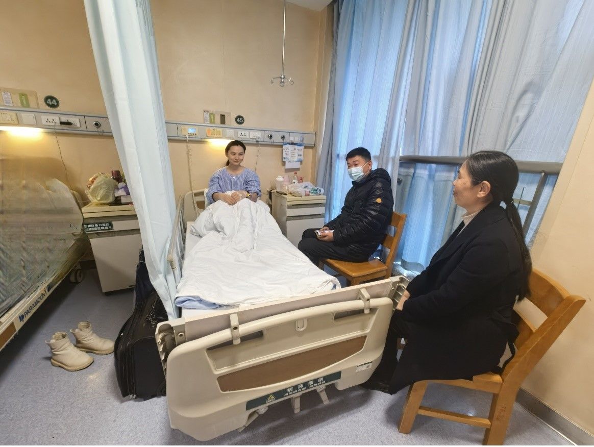 1月15日,工业设计学院副院长苏晨、研究生辅导员何佳欣、熊文涛一行3人前往医院看望慰问患病住院的2023级研究生黄同学。在病房里,苏晨代表学院送上慰问品,在仔细询问了黄同学病情和相关治疗情况后,苏晨嘱咐她谨遵医嘱,继续积极配合治疗,争取早日康复,同时还与学生家长进行了深入交流,详细介绍了黄同学自入校以来的优异表现和学院研究生人才培养所取得的一系列成果。黄同学对于学院的帮助和关怀表达了深深的感谢,并表示会好好治疗,尽快康复,以优异的表现来回报父母和学院老师们的关爱与帮助。黄同学家长也表示孩子来到工业设计学院学习遇到了一个充满爱心的集体,遇到了一群充满爱心的老师和同学,深受感动。