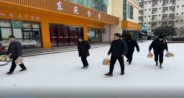 2月22日,新学期开学的第二天,武汉的“霰”雪将校园装扮的银装素裹,伴随着两天多的冰冻雨雪天气,交通出行十分困难,已返校学生的生活与取暖、出行与安全等问题成为全校师生的共同牵挂。为减少学生外出带来安全风险,学院学工办冒雪紧急采购了一批面包、牛奶、泡面、火腿肠等临时生活物资,为学生送去温暖与关怀。
