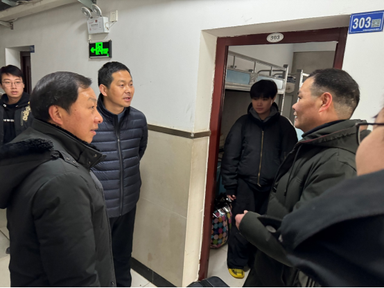 在6栋303寝室门口,正好碰到从广东清远送孩子返校的阮同学的父亲,王地国与其进行了简短交流,详细询问了其返校是否顺畅,近几天的生活物资筹备,以及对学院管理与服务的建议。家长表示,学校老师能在这一刻及时出现在学生身边,就是对学生最大的关怀与鼓励,并对学校细致入微的教育与服务表示感谢。