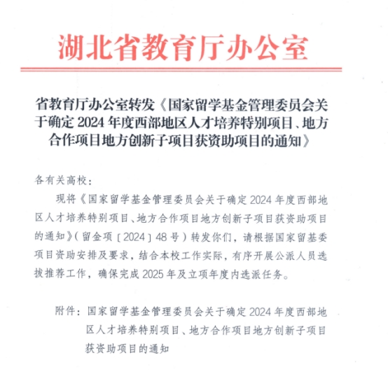 新年伊始,从湖北省教育厅传来好消息,我院申报的“高端制造装备的创新复合型国际化人才培养项目”成功获批国家留学基金管理委员会(下称“留基委”)资助的2024西部地区人才培养特别项目、地方合作项目地方创新子项目。该项目由我院国际交流与合作办公室主任施琦老师代表学院申报,并于2024年底赴吉林大学参与留基委答辩,经过多次协调修改,最终成功获批该项目。