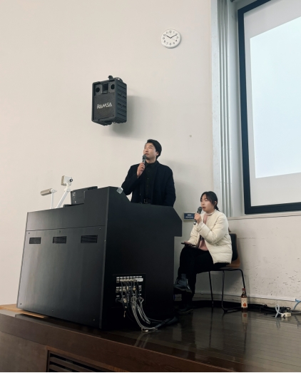 图2施琦老师在该校报告厅做学术报告,广岛市立大学博士研究员高飞(右1)做翻译