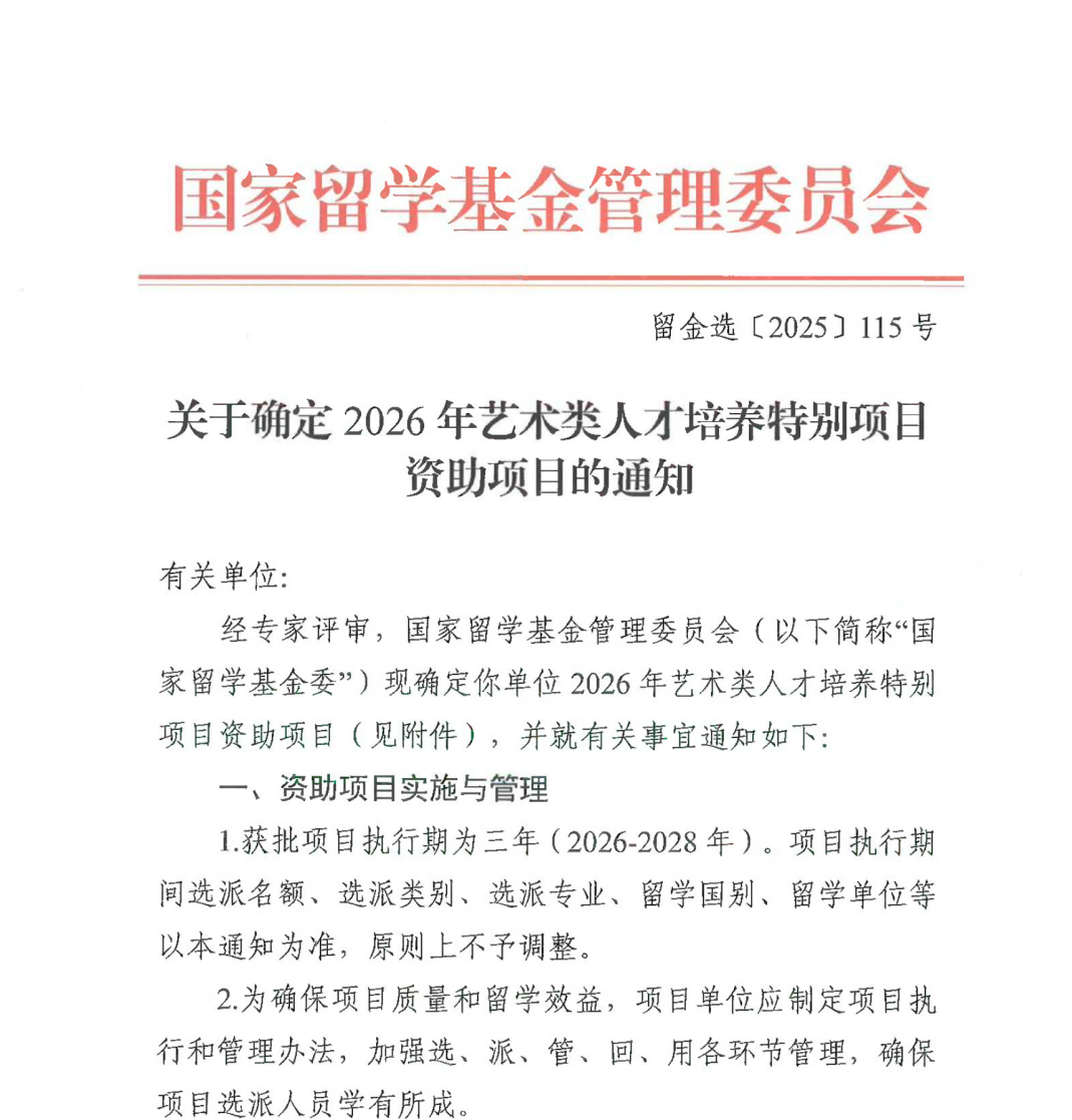 2025年12月1日,国家留学基金委员会发布文件,公布了《2026年艺术类人才培养特别项目资助项目的通知》。我院国际交流与合作办公室主任施琦代表学校申报的“人工智能时代可持续设计”艺术类人才培养特别项目成果获批。