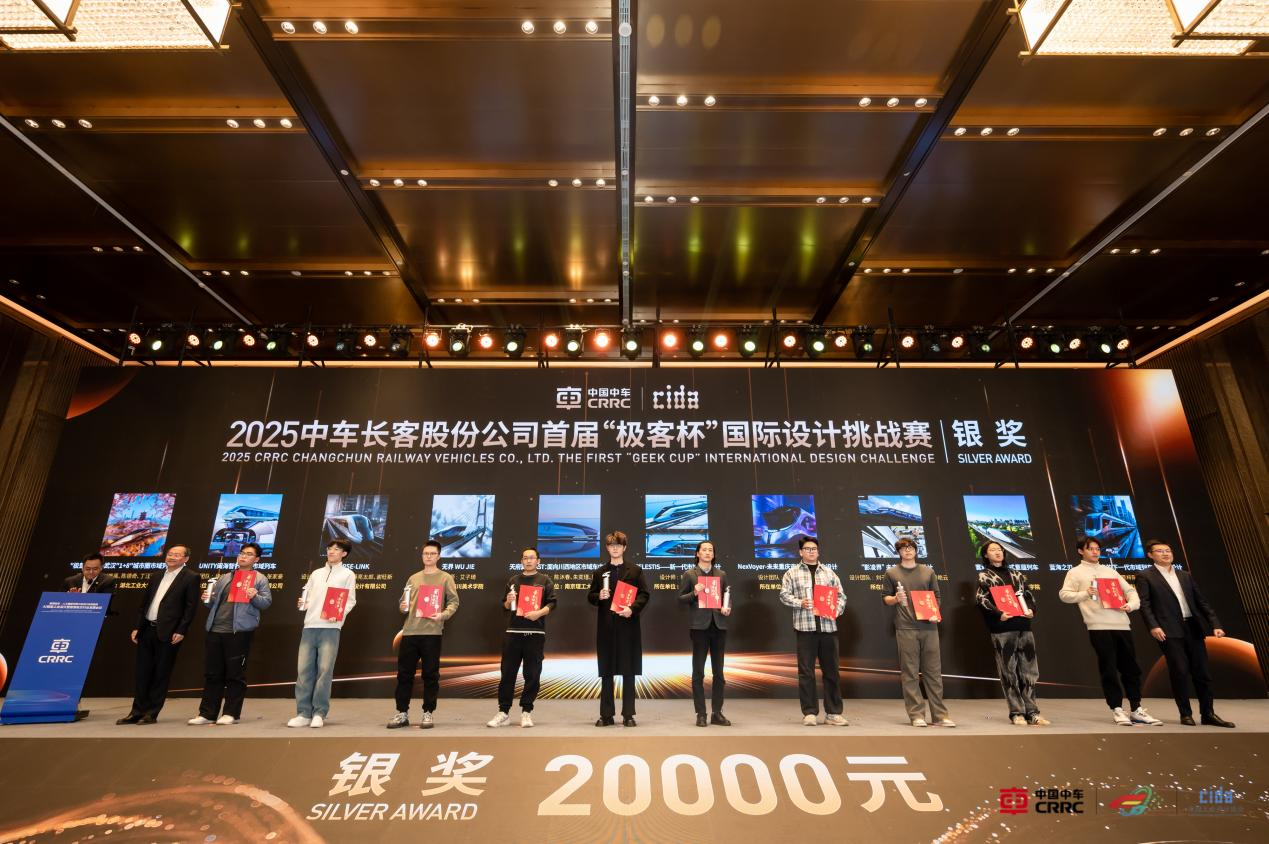 会议期间公布了2025中车长客股份公司首届“极客杯”国际设计挑战赛获奖名单。我院提交的作品《“极楚号”——武汉“1+8”城市圈市域列车设计》,从全国600余件参赛作品中脱颖而出,成功晋级总决赛并跻身50强。在12月17日的终审答辩中,团队凭借扎实的专业功底与鲜明的创新理念赢得评委高度认可,最终在18日的颁奖典礼上荣获大赛银奖。