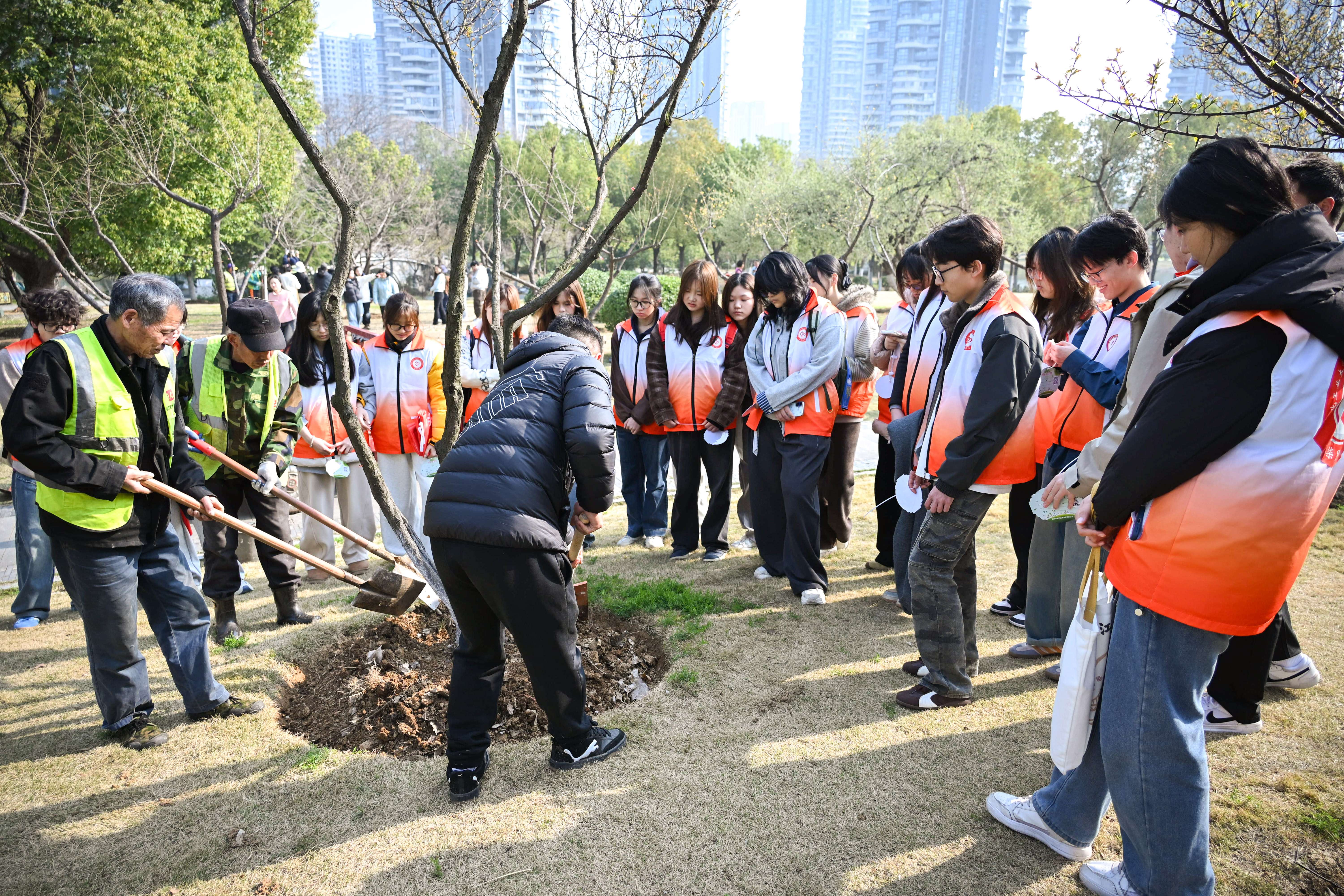 3月12日植树节当天,学院组织党员先锋与青年志愿者赴武昌区沙湖公园开展“植绿沙湖,躬行践悟”树木认养与生态养护志愿服务活动。在园林师傅指导下,志愿者们翻土施肥、培土养护,认养树木并悬挂认养牌,以实际行动践行“绿水青山就是金山银山”的生态文明理念,推动劳动教育与志愿精神深度融合。