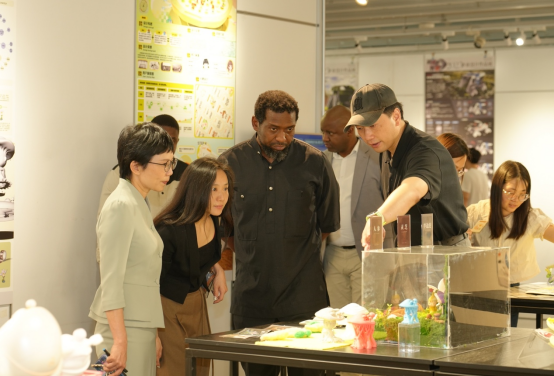 随后,马纳梅拉一行来到了艺术楼展厅,参观我院2025届本科和硕士毕业生毕业设计作品展。他对毕业生琳琅满目的作品大加赞赏,尤其是电动车设计与中国传统文化的现代化表达等作品非常感兴趣。
