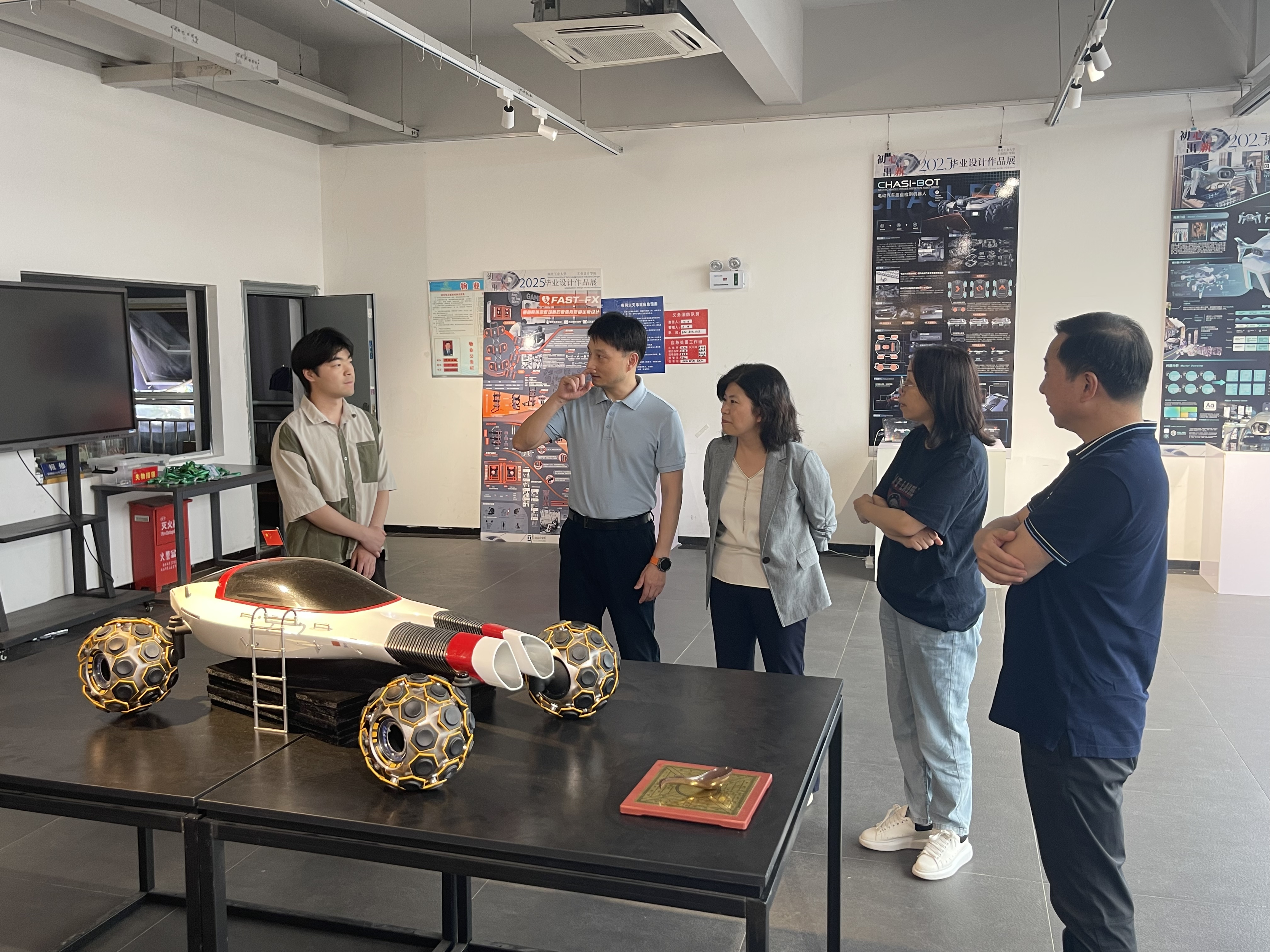 在交通工具设计方向展区,胡晓艳重点参观了交通系作品《司南乘舆——载人火星车》项目。得知该项目学生已被东风汽车集团录用,她对学生扎实的专业能力和良好的就业前景表示欣慰,肯定了学院在服务国家战略和高端制造领域中所发挥的重要作用。她指出,工业设计学院要持续加强与头部企业的深度合作,紧贴产业需求,不断优化人才培养模式,输出更多具有创新力和实战能力的设计人才。